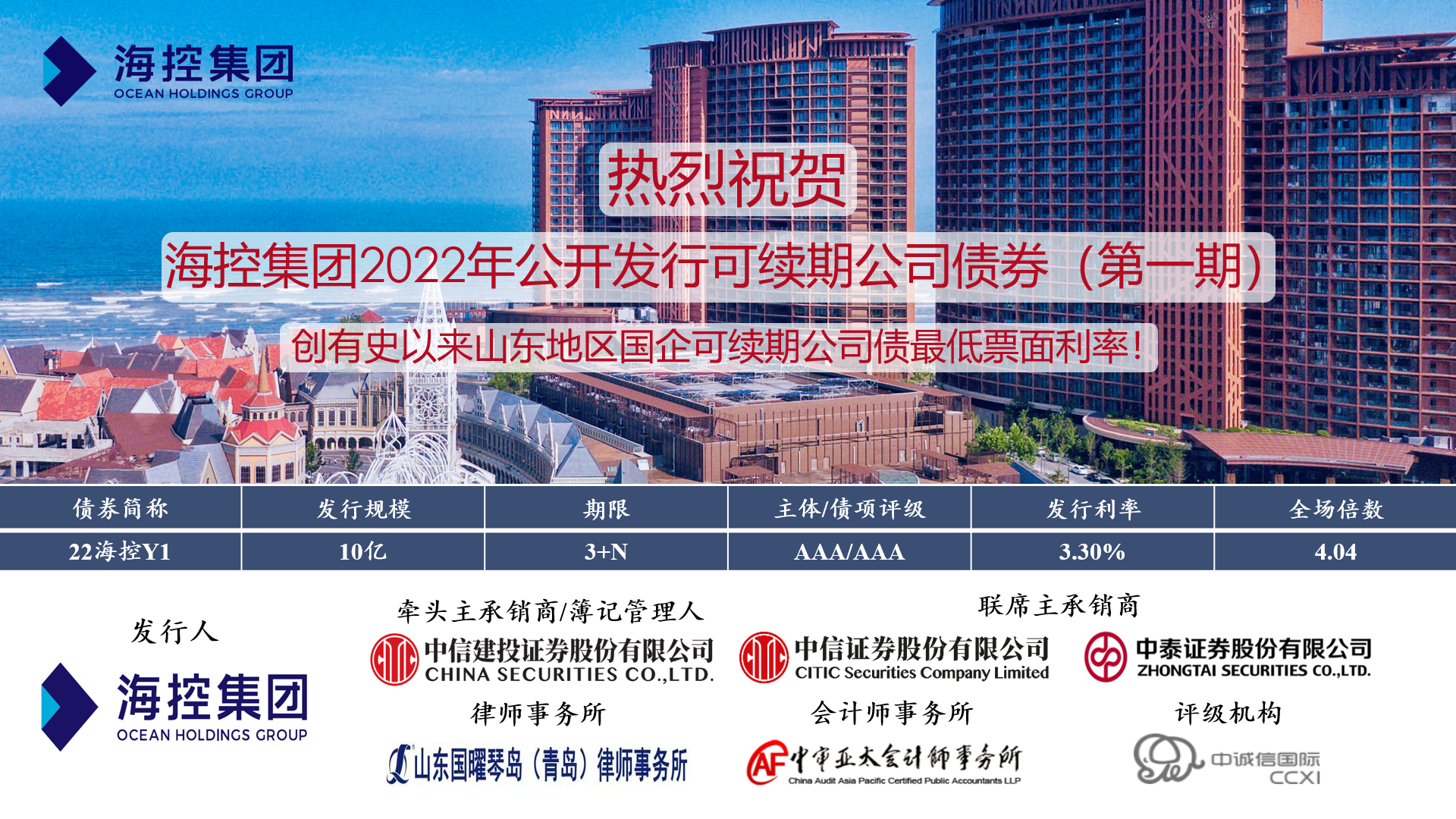 近日,??丶瘓F“2022年公開發(fā)行可續(xù)期公司債券(第一期)”成功發(fā)行,期限3+N年,發(fā)行金額10億元,認購倍數(shù)4.04,發(fā)行票面年化利率3.30%,創(chuàng)有史以來山東地區(qū)國企可續(xù)期公司債券最低票面利率。