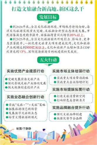 在發(fā)展目標(biāo)方面,《方案》明確提出,到2024年底,全區(qū)文化旅游環(huán)境、市場秩序持續(xù)向好,海洋文化旅游實(shí)現(xiàn)重大突破,文旅融合新型業(yè)態(tài)快速發(fā)展,市民游客滿意度穩(wěn)步提升,游客接待量同比增長20%以上。到2025年底,全區(qū)文化旅游國內(nèi)外吸引力、影響力、競爭力顯著提升,一批優(yōu)質(zhì)文旅重點(diǎn)項目建成使用,文化和旅游產(chǎn)業(yè)規(guī)模達(dá)到900億元以上,文化和旅游產(chǎn)業(yè)增加值占GDP比重達(dá)到13%,國際濱海旅游目的地建設(shè)初見成效。