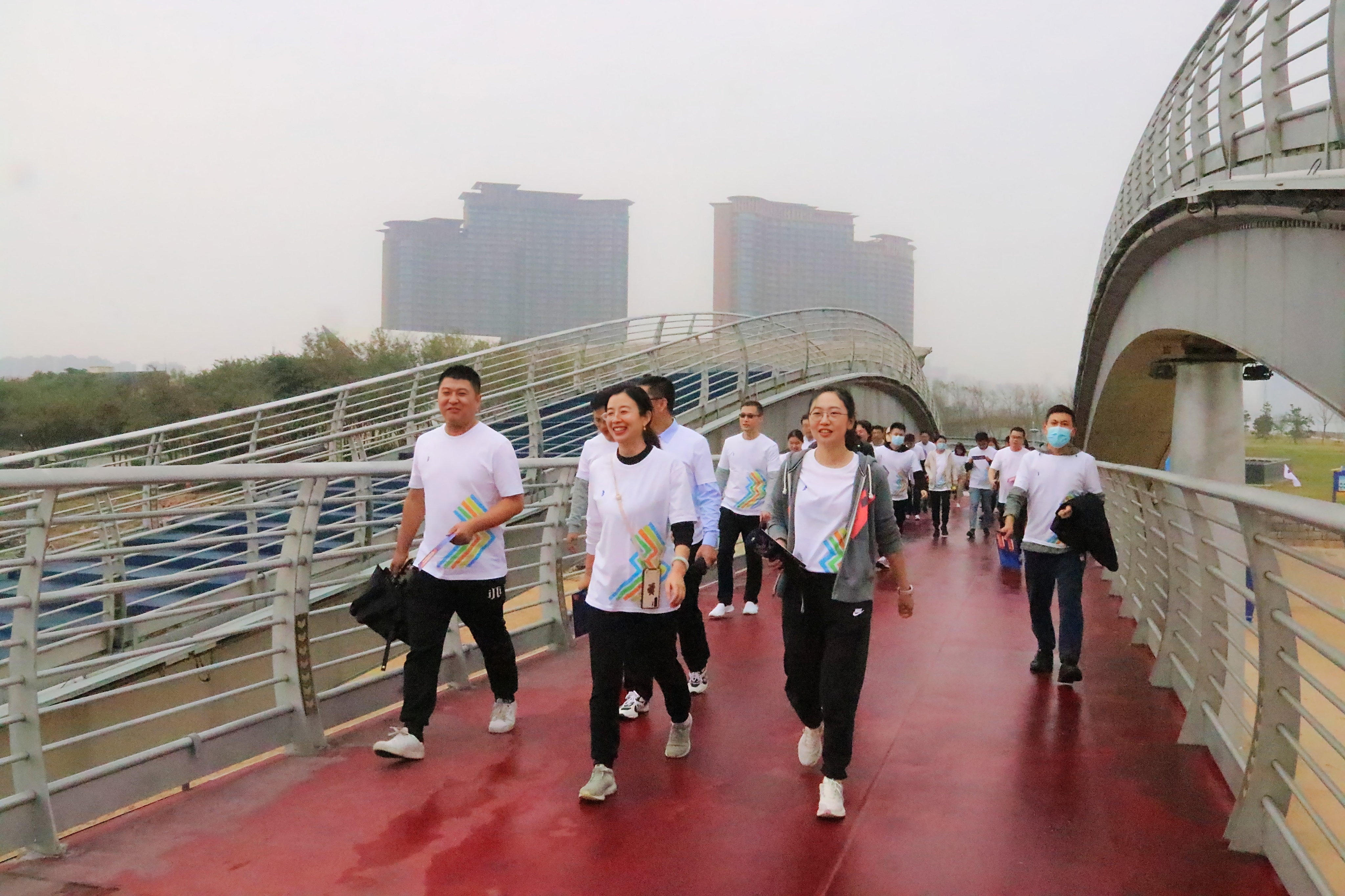 蒙蒙細(xì)雨,也擋不住大家的熱情。下午3時(shí)許,在集團(tuán)黨委副書記王文景同志的宣布下,"活力海控 攜手同行"健步行活動(dòng)正式開始,身著統(tǒng)一服裝的健步行隊(duì)伍從彩虹橋南岸出發(fā),浩浩蕩蕩,闊步前行。
